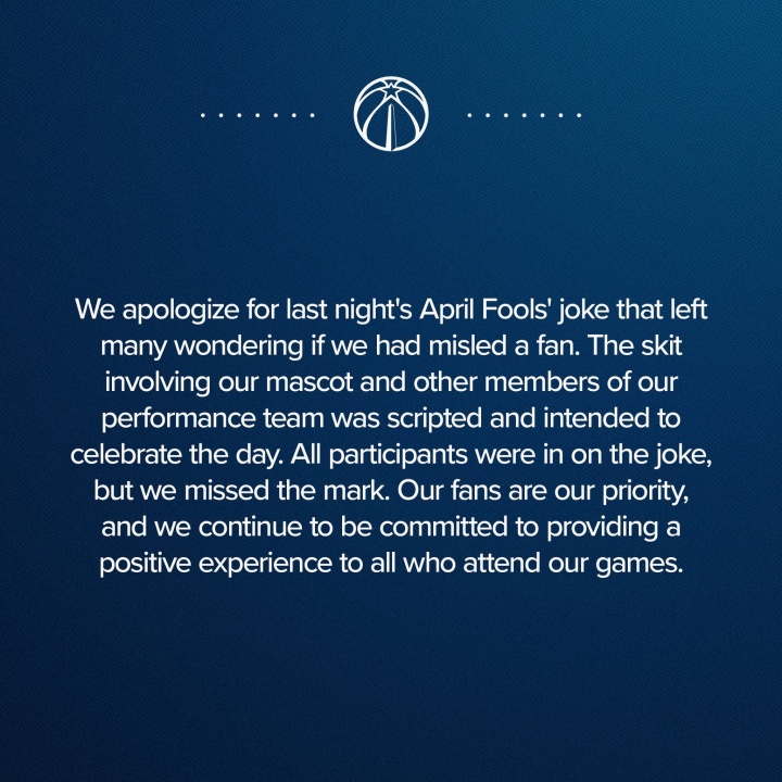04月03日讯 奇才官方今日发布声明,表示为愚人节恶作剧向球迷道歉。